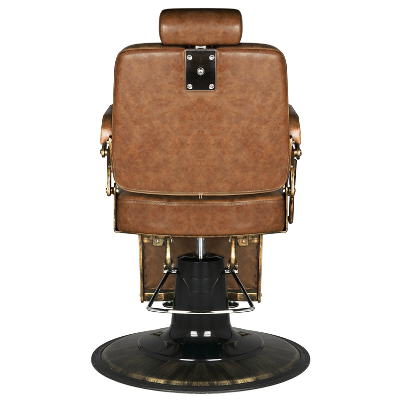 The retro-style barber chair impresses with its elegant design inspired by the classic automotive industry. The solid, round base ensures stability and comfort of use. The seat filled with deformation-resistant foam and upholstered with pleasant-to-touch synthetic leather guarantees comfort and durability for years. The materials used also make the equipment resistant to moisture and easy to clean. The quilted upholstery in a shade of light brown, made with attention to detail, emphasizes the luxurious character of the furniture. The stylised metal armrests and frame in a shade of aged gold give the whole thing a unique character.
