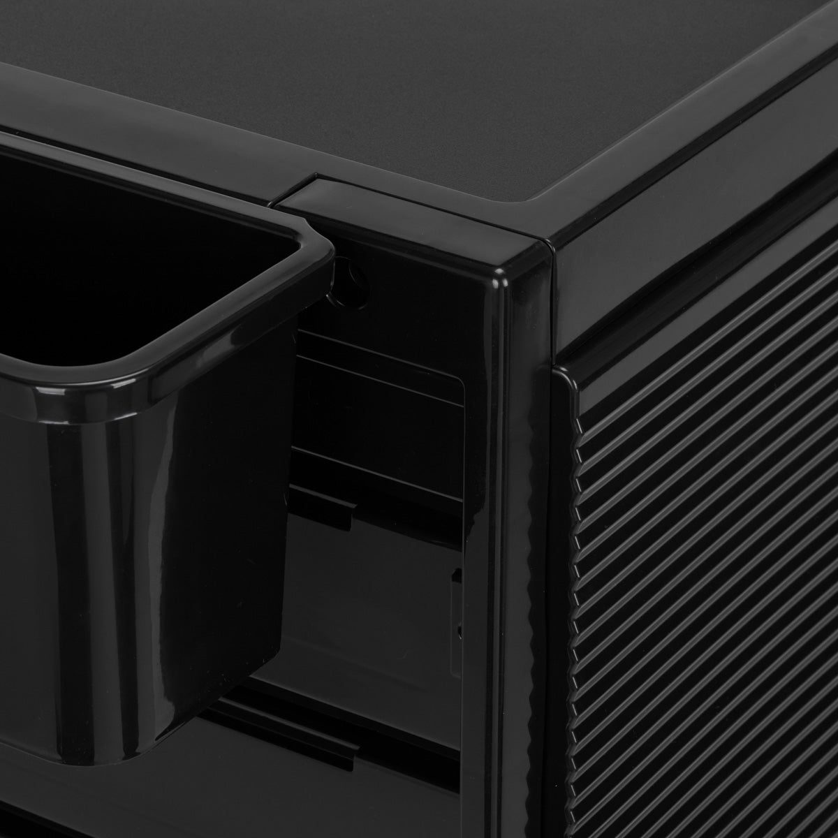 The capacious organizer is equipped with a set of storage trays that will help to ensure order in the workplace, sorting out the tools necessary for the hairdresser's work. The set includes six containers: two without compartments, two with compartments and two narrow and deeper ones. Their arrangement in the organizer can be freely changed at will to suit your own needs, and a large selection of different types of drawers allows you to segregate the utensils at your discretion. In addition, the two deepest cuvettes can be placed at different heights on the sides of the helper, so that the utensils placed in them will always be at the right level. The enclosed back panel prevents the drawers from accidentally being pulled out the other way, which could result in damage to the utensils inside.
