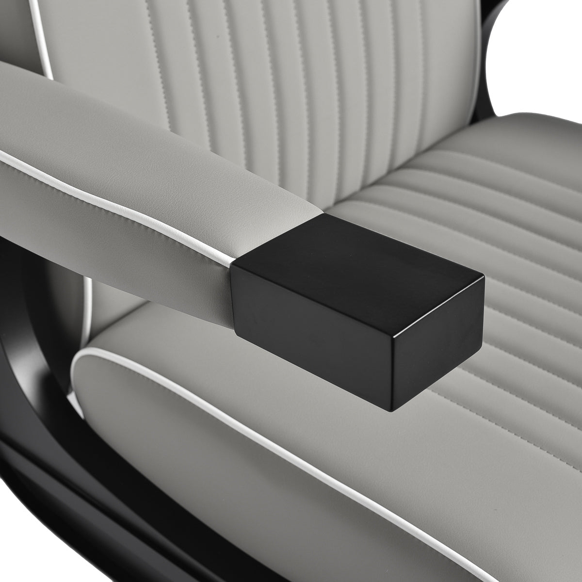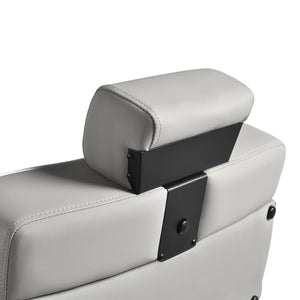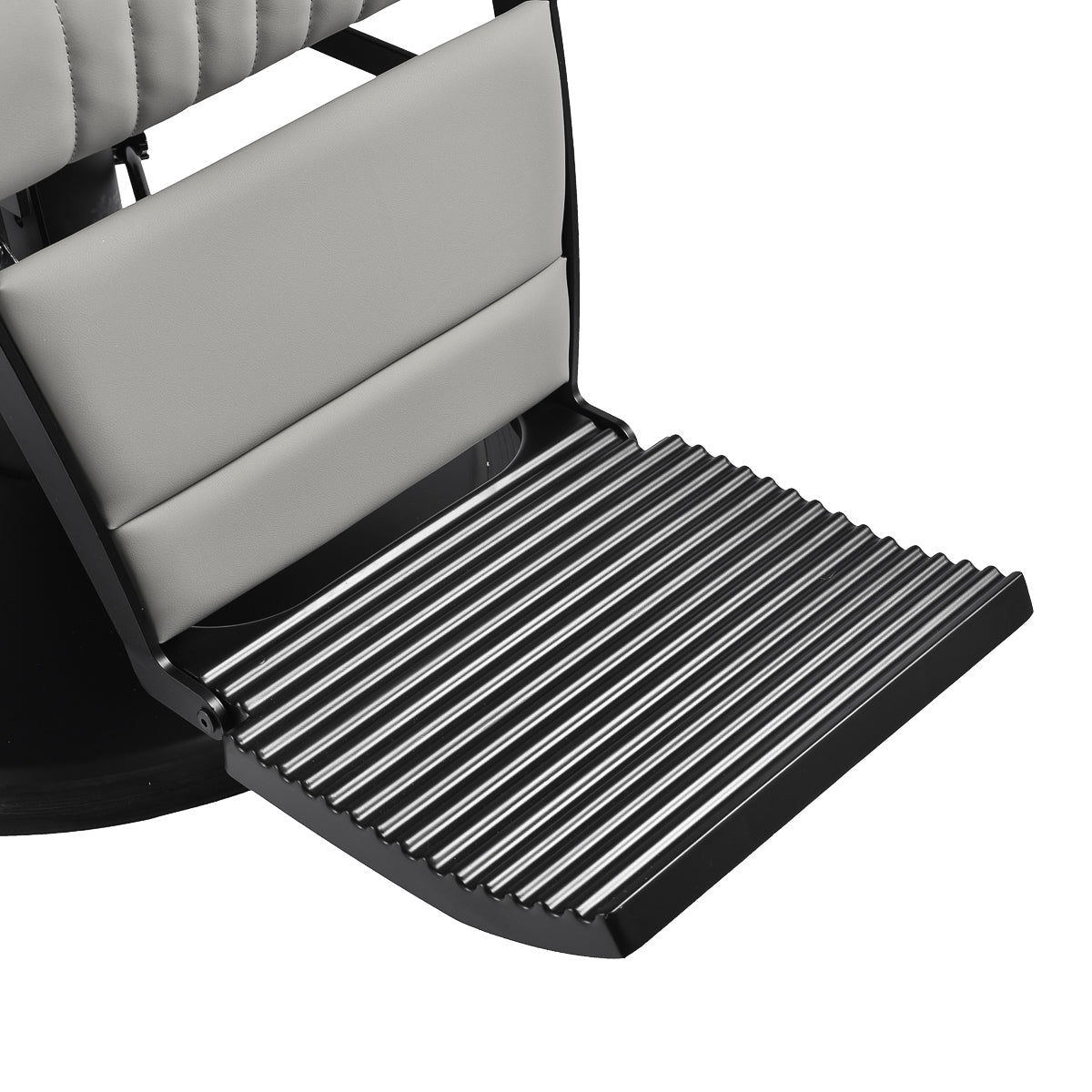 The black, round base ensures stability and durability. The soft, matte synthetic leather upholstery combines comfort with durability. The materials used are moisture-resistant, durable and easy to clean. Stylish stitching and grey-toned upholstery give it a unique character, perfectly complementing the décor of modern barbershops. The combination of the elegant upholstery colour with the black frame and base emphasises the modern, professional look of the chair.
