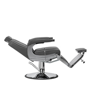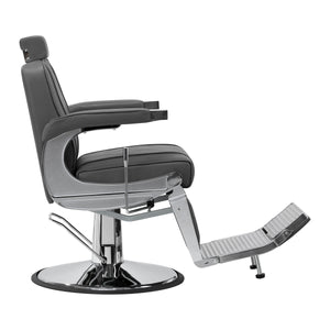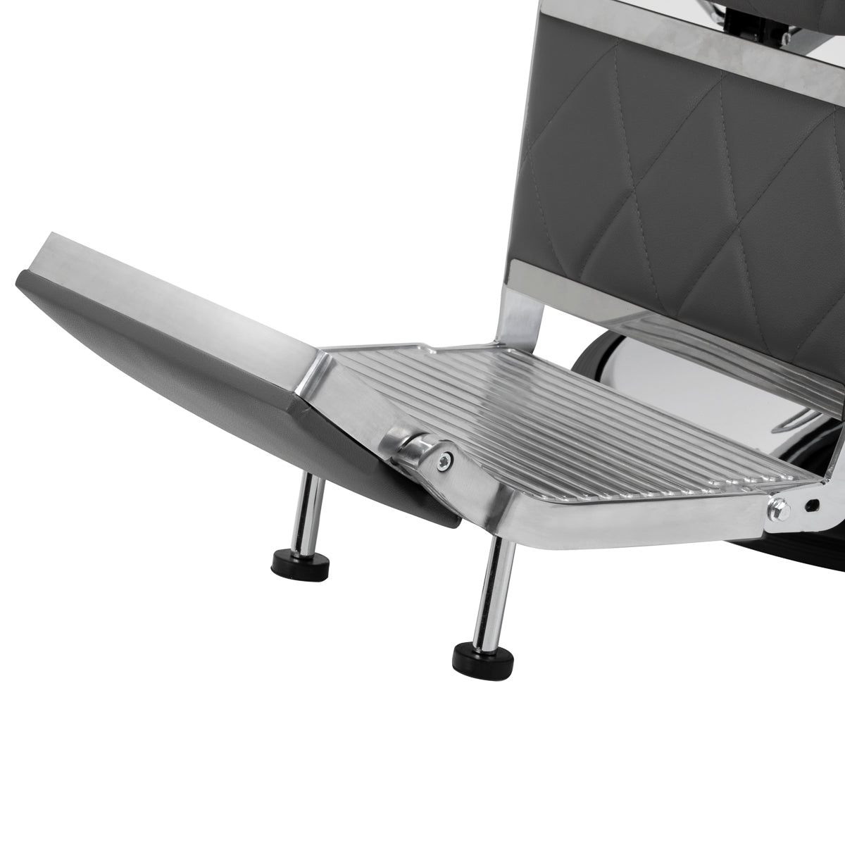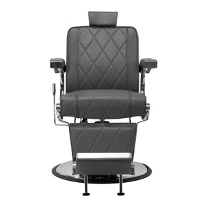 The chair's solid round base construction ensures stability and excellent user comfort. The seat filling, made of deformation-resistant foam, and the upholstery crafted from soft-touch synthetic leather with a matte finish ensure long-lasting durability and comfort during prolonged use. Stylish stitching on the upholstery adds character, evoking automotive design inspirations that enhance its elegant appearance. This feature also makes the chair moisture-resistant, durable, and easy to clean. The upholstery in grey tones gives the chair a unique character, and its minimalist style allows it to blend seamlessly with the decor of any barbershop.