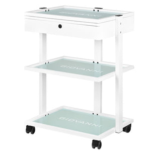 elegant metal and glass table, on rubber wheels. the table has a spacious drawer and two glass shelves with an engraved giovanni logo. it is possible to attach a lamp-magnifier to the table.