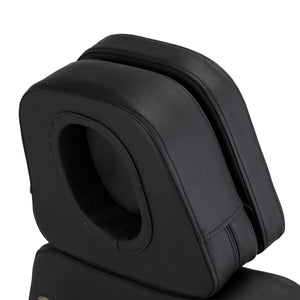 The full rotation mechanism with a lock function provides exceptional functionality, facilitating easy access to the client from all sides and improving work even in confined spaces. The chair's design allows it to be reclined to a comfortable position, and the opening in the headrest, hidden under the cushion, provides adequate support and comfort during treatments in various positions. An additional convenience is the leg rest, which allows for comfortable straddling, and its extension adjustment allows it to be adapted to the needs of users of different heights.