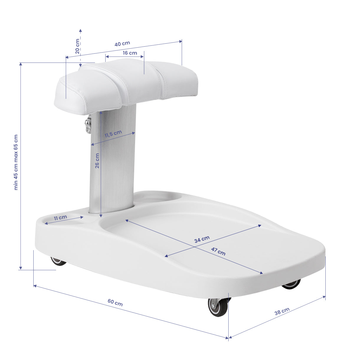 A lábtartó három részből áll, amelyek közül a középső kihúzható. A kézi magasságállítás lehetővé teszi, hogy maximum 20 cm-rel megemelhető legyen. A lábtartó minden eleme szintetikus bőrrel van kárpitozva, ami ellenállást biztosít a nedvességgel szemben és könnyen tisztítható. Ennek eredményeként a kocsi a felhasználó egyéni igényeihez igazítható, ami kiváló megoldássá teszi mind a kozmetikai, mind a podológiai kezelésekhez, biztosítva a kényelmet és a precizitást a különböző pozíciókban végzett munkához.