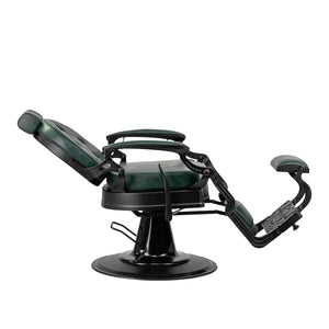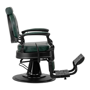 Az alap szilárd felépítése stabilitást és magas használati kényelmet biztosít. Az ülés töltete tartós, deformációnak ellenálló habból készült, a kárpit pedig kellemes tapintású, félmatt felületű szintetikus bőrből, amely biztosítja a bútor tartósságát és kényelmes használatát hosszú ideig. Emellett a berendezést ellenállóvá teszik a nedvességgel szemben, tartóssá és könnyen tisztíthatóvá. A zöld árnyalatú borítás steppeléssel és dekoratív gombokkal egyedi karaktert kölcsönöz neki. A jellegzetes kialakítású szék, amely a vintage stílusra utal, tökéletesen illeszkedik a borbélyszalonok hangulatához, kiemelve azok egyedi atmoszféráját.