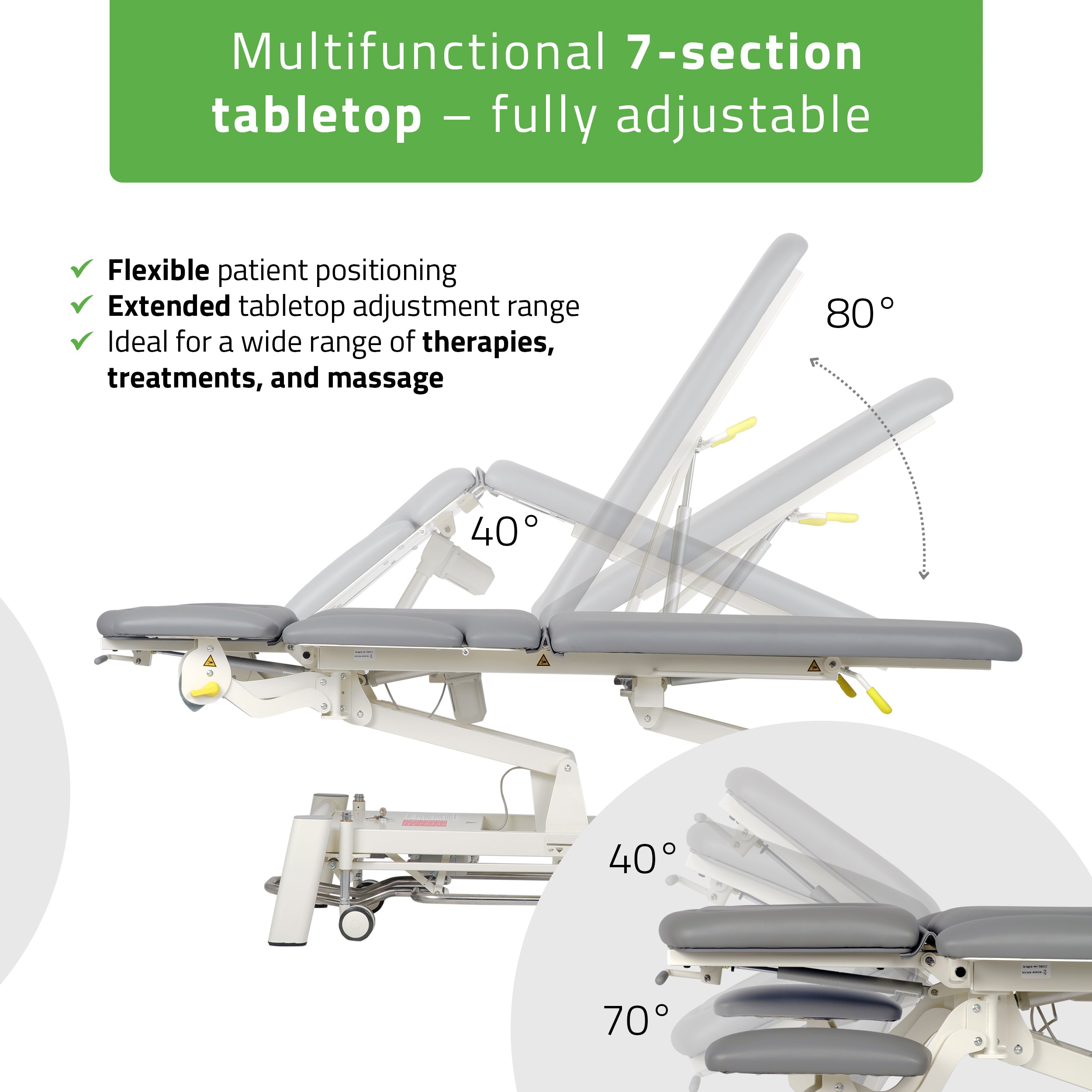 Biztosítja a páciens kényelmét mind fekvő, mind hason fekvő helyzetben – még hosszú és intenzív kezelések során is. A szilárd gázrugós mechanizmus lehetővé teszi a szög beállítását -70° és +40° között.