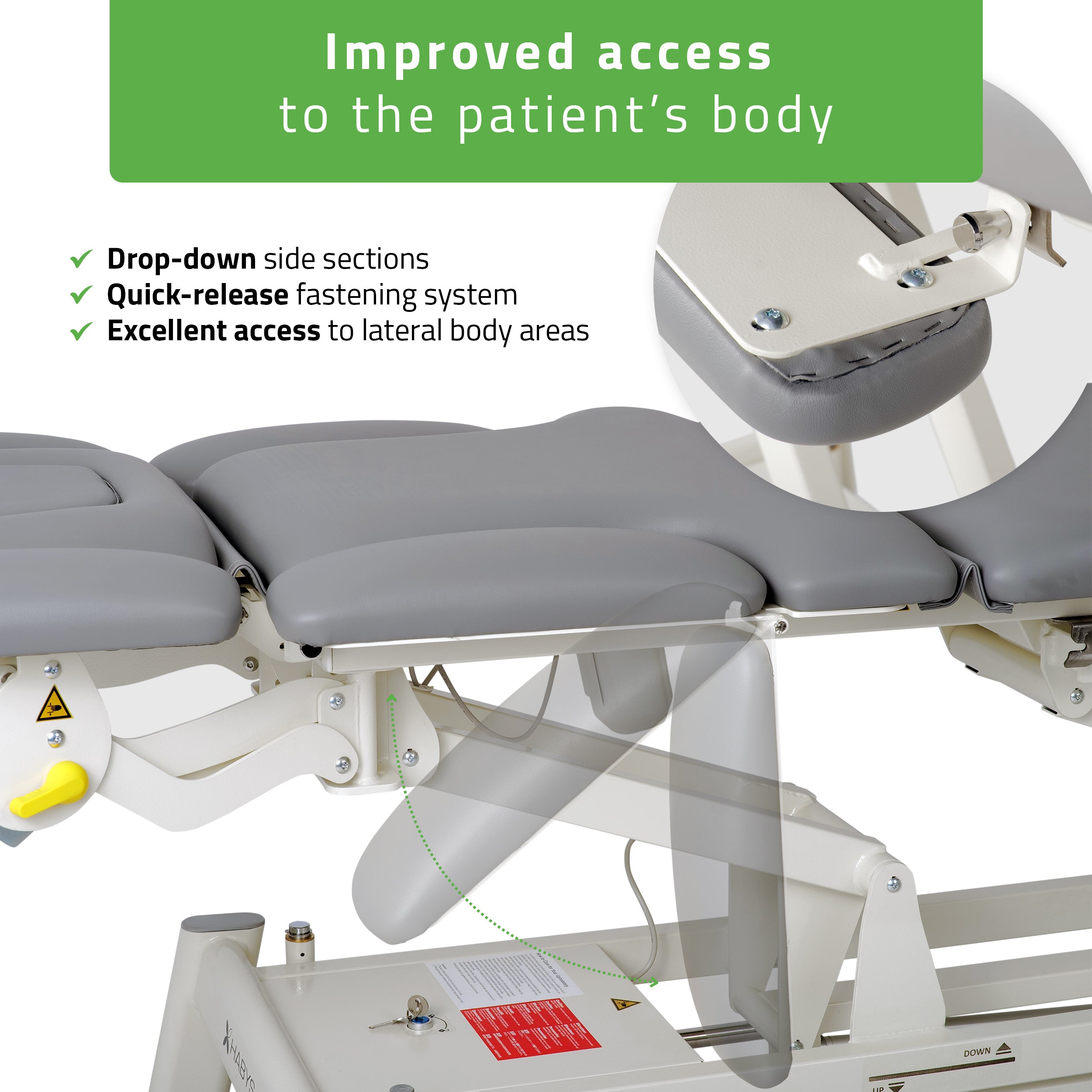Kivételes kényelmet nyújtanak azokhoz a kezelésekhez, amelyek maximális oldalsó hozzáférést igényelnek a páciens testéhez – ideálisak a törzs, a bordák, a rekeszizom vagy a fascia kezeléséhez. Mindkét oldalsó szekció könnyen levehető vagy rögzíthető egy egyszerű pattintós zár mechanizmus segítségével.