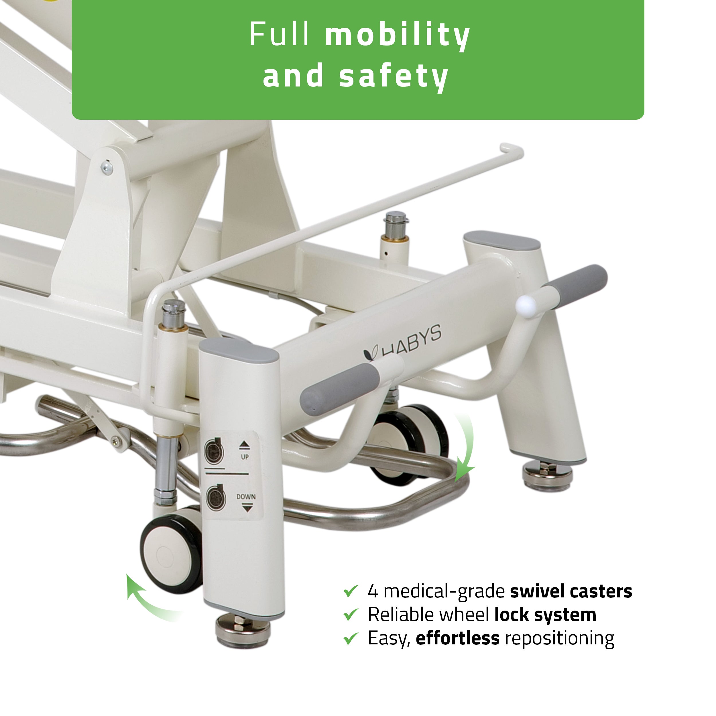Négy orvosi minőségű forgó görgő záró funkcióval lehetővé teszi az asztal könnyed áthelyezését, amikor szükséges.