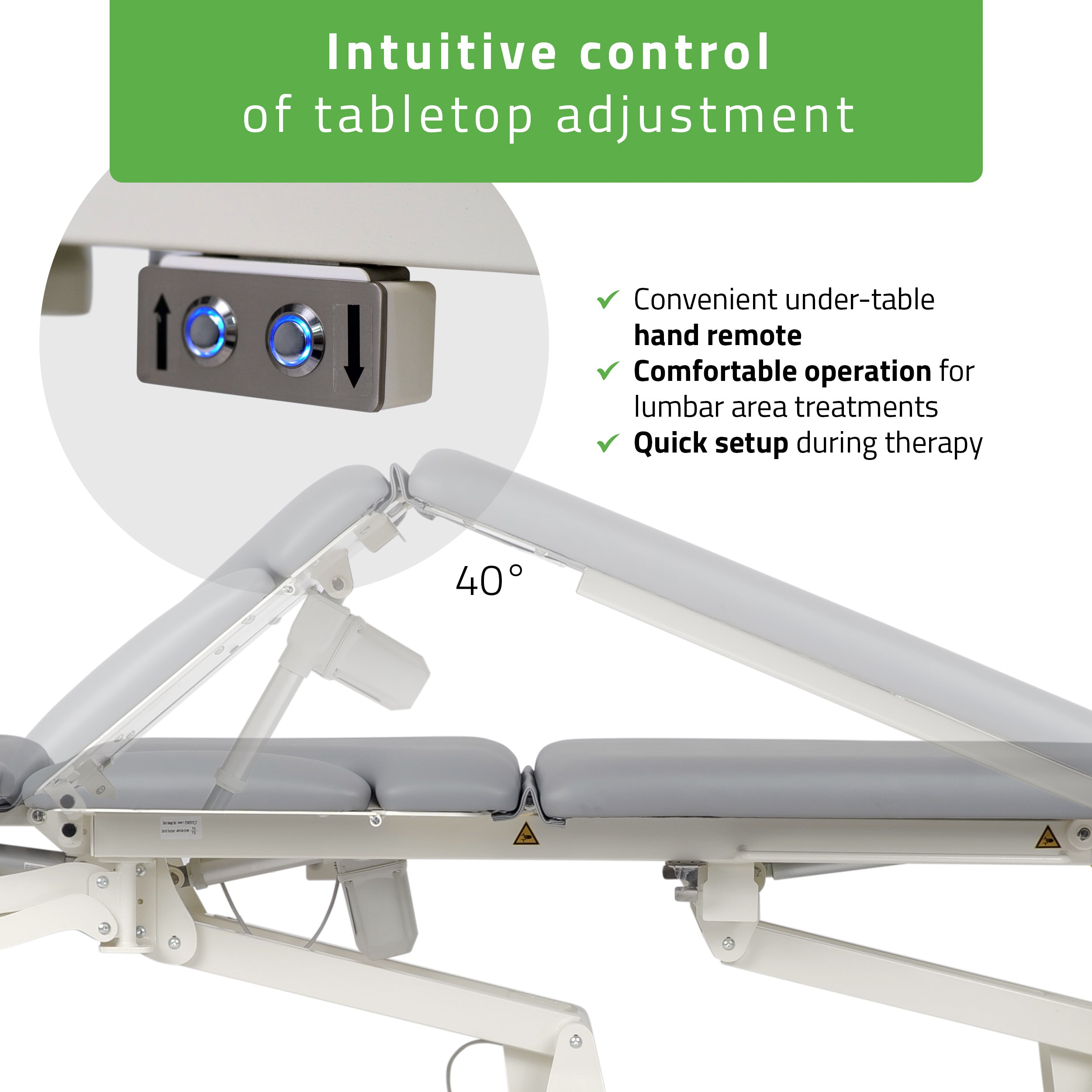Megkönnyíti a pontos medence- és ágyéki pozicionálást – támogatva a fasciális, mobilizációs, relaxációs és nyirokelvezető technikákat. A kézi vezérlő közvetlenül az asztallap alatt található, lehetővé téve a gyors és intuitív beállításokat anélkül, hogy megszakítaná a kezelést vagy megváltoztatná a terapeuta testhelyzetét.