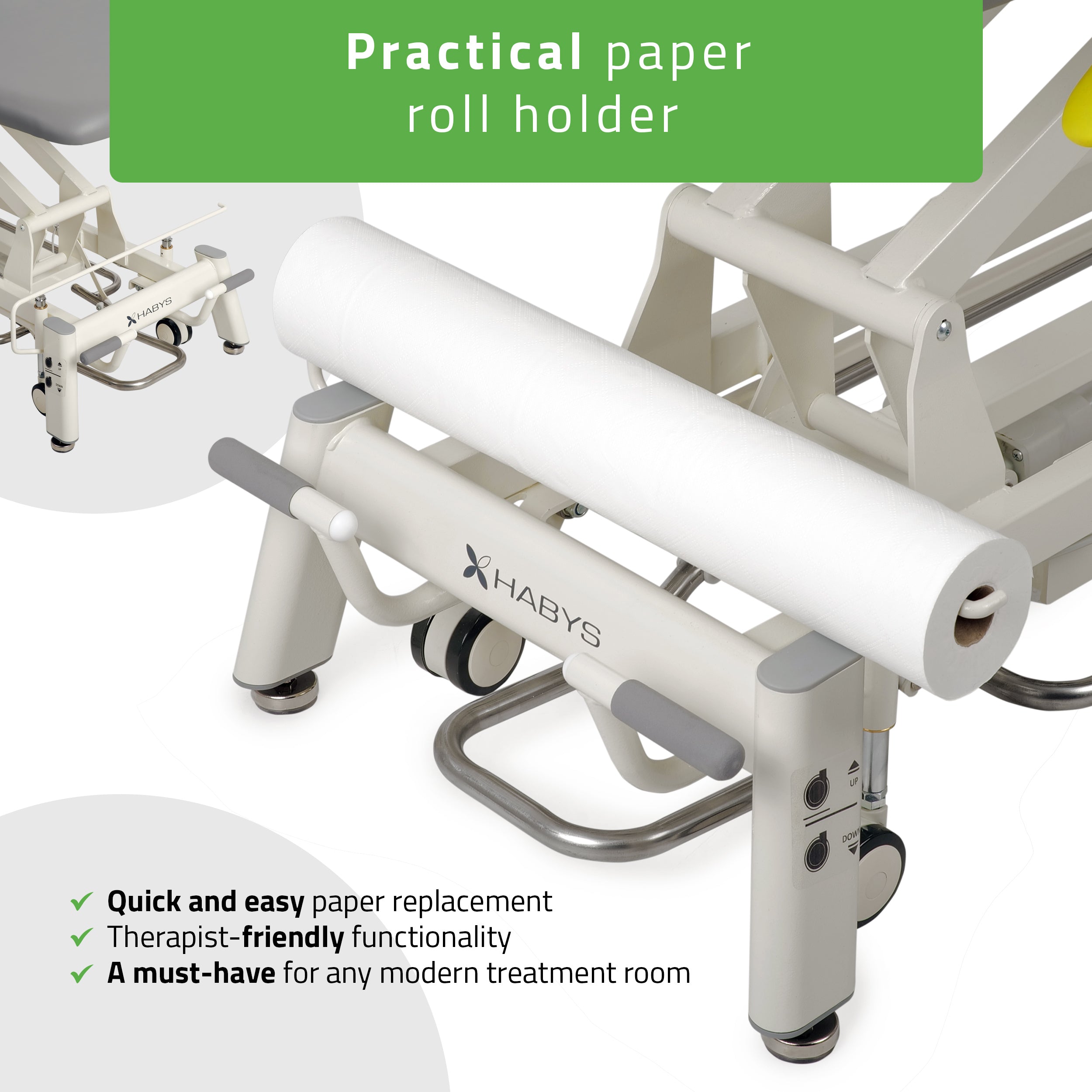 Praktikus kiegészítő, amely lehetővé teszi a higiéniai papír gyors és egyszerű cseréjét a kezelések során.