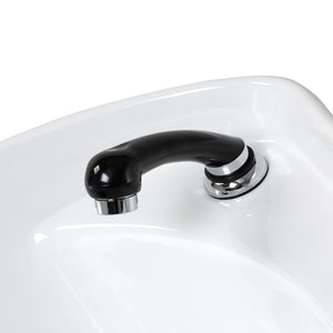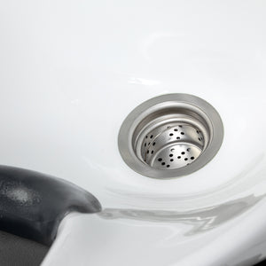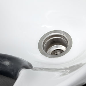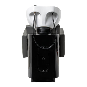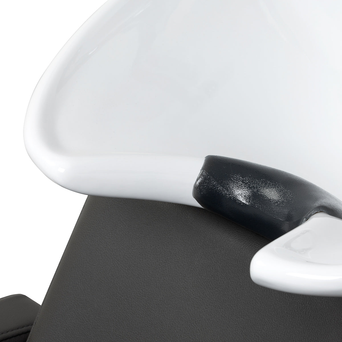 A fehér árnyalatú mély kerámia tál hatékonyan csökkenti a víz és a kezelések során használt készítmények fröccsenését. Ez elősegíti a különböző fodrászati szolgáltatások kényelmes és pontos elvégzését. A tál mozgatható felépítése lehetővé teszi a dőlésszög egyszerű beállítását az egyéni igényekhez. A felhasznált anyag tartós, ellenáll az elszíneződésnek és a karcolásoknak, és könnyen tisztán tartható. A megfelelően profilozott gallér kényelmes fejtámaszt biztosít mosás közben, míg a fekete árnyalatú kényelmes műanyag borítás megszünteti a kerámia felület hideg érzetét.