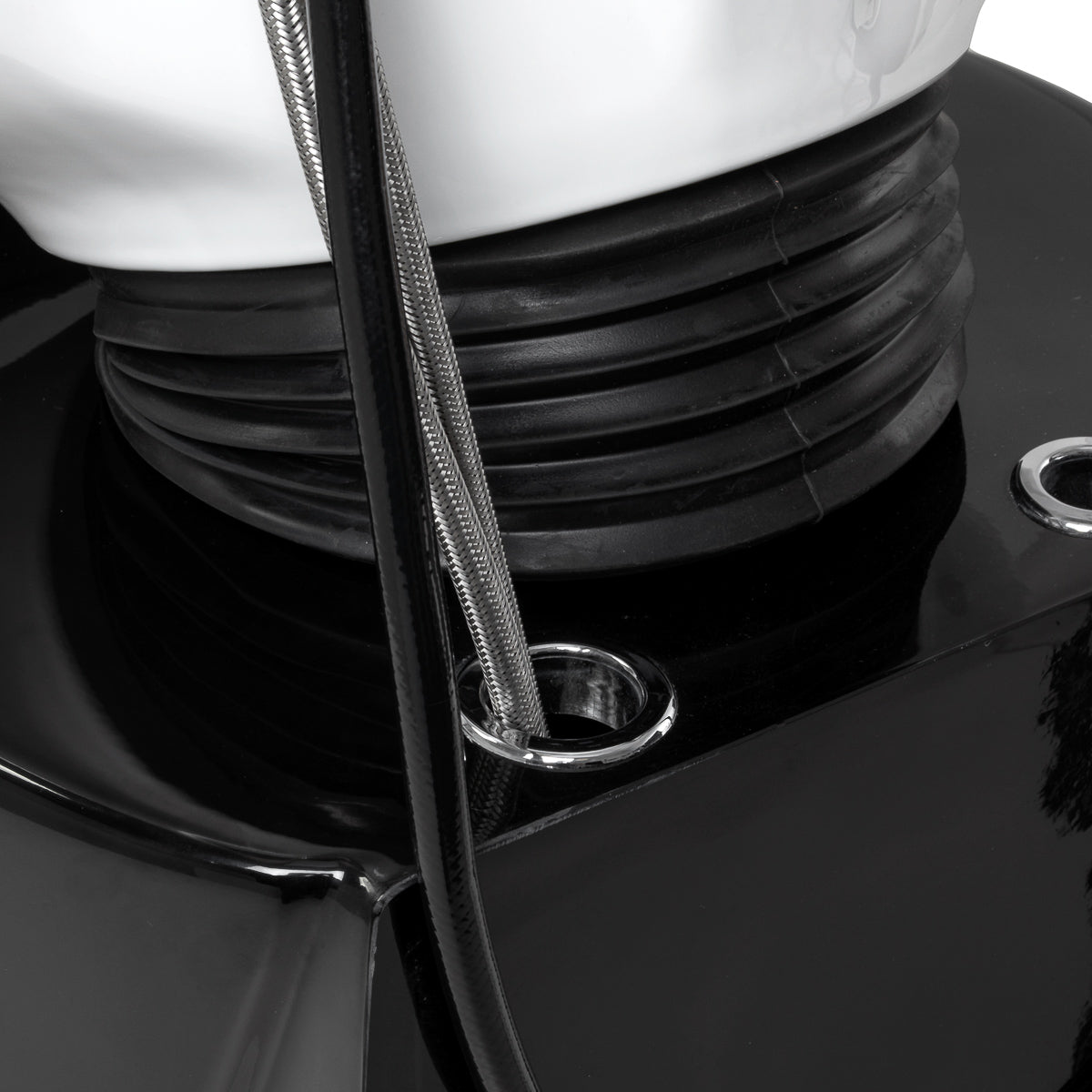 A hajmosó egység keverőcsappal van felszerelve a kényelmes meleg és hideg vízhez, valamint a hőmérséklet egyszerű beállításához az ügyfél igényei szerint. A zuhanyfej elhelyezésére szolgáló praktikus hely megkönnyíti a munka szervezését és a munkaállomás rendben tartását. A szűrővel ellátott dugó lehetővé teszi a vízáramlás szabályozását, miközben magas higiéniai előírásokat tart fenn. A készlet tartalmazza a teljes szerelvényt – csapot, zuhanyfejet és dedikált tömlőket, amelyek egy készen álló készletet alkotnak. A vízcsatlakozás a hajmosó egység alapjának belsejében lett elhelyezve, lehetővé téve a beépítés esztétikus elrejtését. A mosó alapjában helyek vannak a padlóhoz való csavarozáshoz – ez a megoldás növeli a teljes szerkezet stabilitását. A funkcionális megoldások és a jól átgondolt részletek kombinációja a fodrászszalonban végzett mindennapi munka kényelmét jelenti.
