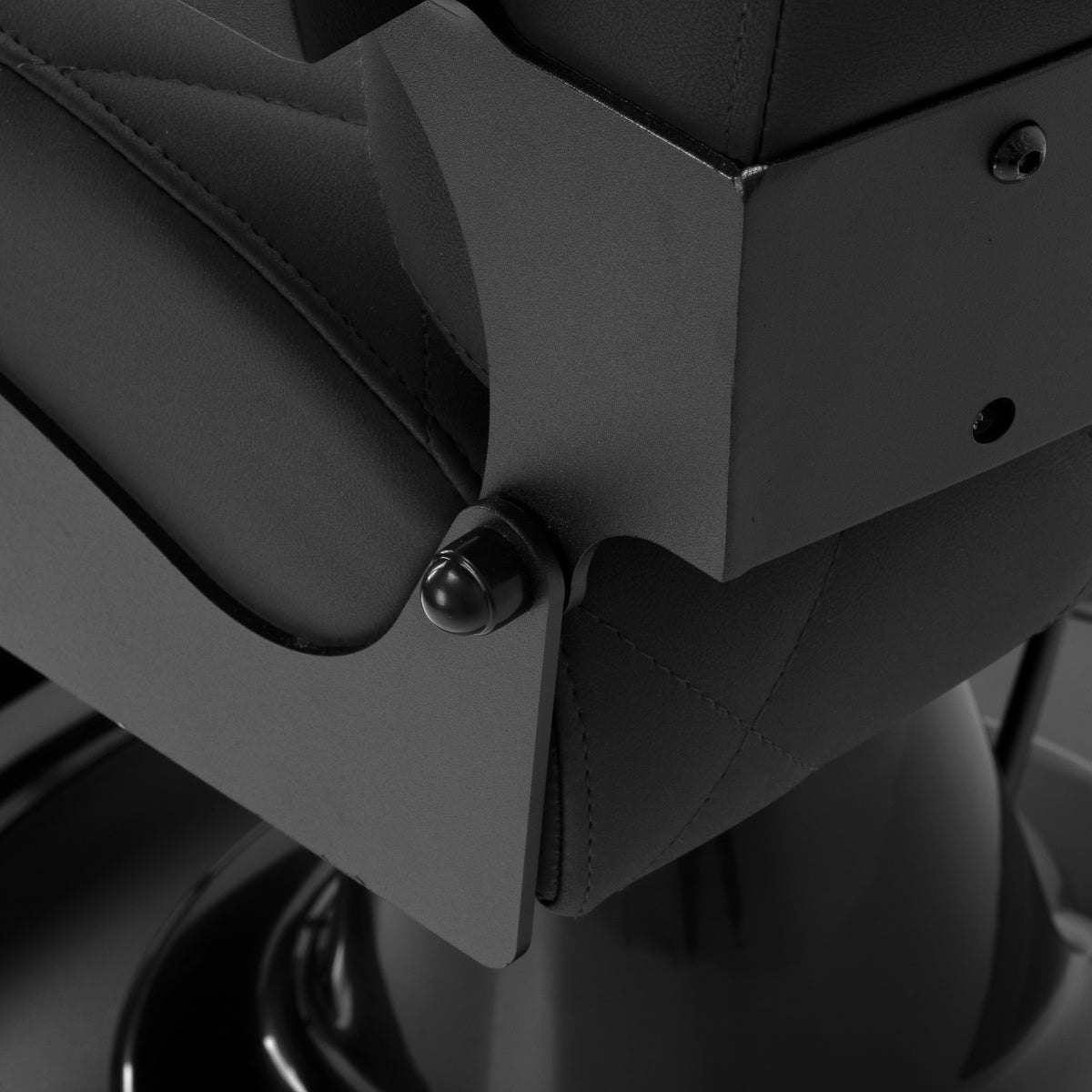 A stabil szerkezet biztonságot és hosszú távú tartósságot biztosít. A deformációnak ellenálló habbal töltött ülés és a puha, szintetikus bőrből készült kárpitozás tartósságot és kényelmet biztosít. A nedvességálló anyagok nemcsak tartósak, hanem könnyen tisztíthatók is. A fekete kárpitozás fekete vázzal kombinálva modern és professzionális megjelenést kölcsönöz a széknek, míg minimalista stílusa lehetővé teszi, hogy bármely borbélyszalon dekorációjába illeszkedjen.