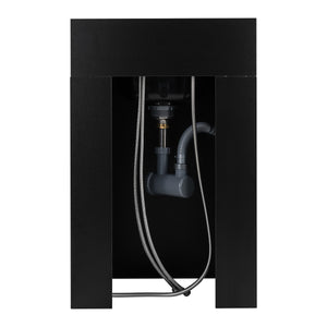 A fodrászati állomás mélyfekete árnyalatú bútorlapokból készült, ami elegáns és kifejező karaktert kölcsönöz neki – tökéletesen illeszkedve a modern belső terekbe. A készlet krómozott szerelvényeket tartalmaz: csaptelepet, zuhanyfejet és flexibilis tömlőket, biztosítva a teljes funkcionalitást. A króm akcentusok tökéletesen illeszkednek a szerkezet matt felületéhez, kiemelve a modern stílust és a bútor professzionális kivitelét.