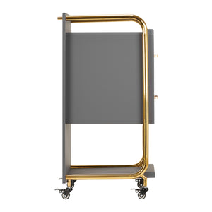 A kiváló minőségű Gabbiano Solo fodrász segédeszköz egy elegáns berendezési tárgy, amely jelentősen javítja a munkát a fodrászszalonban. Két tágas fiók és két különböző méretű polc jelentősen megkönnyíti a termékek és a szükséges eszközök rendszerezését. Fékkel ellátott gumírozott kerekek biztosítják a megfelelő mobilitást, amely lehetővé teszi a bútor elhelyezését bárhol a fodrászszalonban. Elegáns kialakítás – polírozott fém elemek arany árnyalatokban és stabil szerkezet szürke árnyalatú fa lapokból – tökéletesen kiemeli a belső terek karakterét.