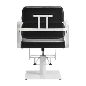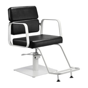 A szék teljes forgási mechanizmusa a fodrász munkáját hatékonyabbá és kényelmesebbé teszi. A szilárd, lapos, négyzet alakú alap stabilitást garantál használat közben. A matt felületű, sima felület elegáns megjelenést kölcsönöz az elemnek, és könnyen tisztán tartható. A hab töltetű kényelmes ülés magas használati kényelmet biztosít, még a több órás kezelések során is. A geometrikus, fém karfák lehetővé teszik a vendég vállainak helyes elhelyezését – ez azt jelenti, hogy nem húzza fel a fejét a vállába, vagy nem görnyed – ami sokkal könnyebbé teszi a precíz kezelések elvégzését, beleértve a hajvágást is. Az ehhez a modellhez dedikált stílusos lábtartó stabil támaszt nyújt a felhasználó lábainak.