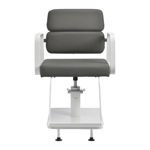 A szék teljes forgási mechanizmusa hatékonyabbá és kényelmesebbé teszi a fodrász munkáját. A masszív, lapos, négyzet alakú alap garantálja a stabilitást használat közben. A matt felületű, sima felület elegáns megjelenést kölcsönöz az elemnek, és könnyen tisztán tartható. A habbal töltött kényelmes ülés magas használati kényelmet biztosít, még a sok órás kezelések során is. A geometrikus, fém kartámaszok lehetővé teszik az ügyfél vállainak helyes elhelyezését – ez azt jelenti, hogy nem temeti a fejét a vállába, és nem görnyed – ami sokkal könnyebbé teszi a precíz kezelések elvégzését, beleértve a hajvágást is. Az ehhez a modellhez dedikált stílusos lábtartó stabil támaszt nyújt a felhasználó lábainak.