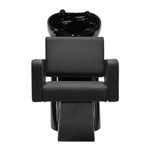 A fekete árnyalatú mély kerámia mosdótál minimalizálja a víz és a kozmetikumok fröccsenését a kezelések során. Az állítható mosdótál szög lehetővé teszi a pontos beállítást az ügyfél igényeihez. Tartós anyagból készült, ellenáll az elszíneződésnek, a karcolásoknak és a vegyszereknek, sima felülete pedig megkönnyíti a tisztán tartást. Az ergonómiailag profilozott gallér kényelmes fejtámaszt biztosít, míg a fekete műanyag borítás megszünteti a hideg érzetét a kerámia érintésekor.