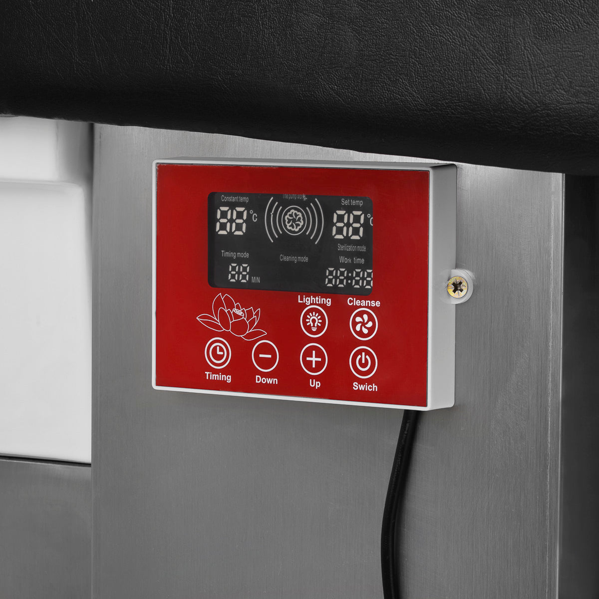 Az intuitív érintőpanel teljes ellenőrzést biztosít a mosóegység funkciói felett. Lehetővé teszi a működési idő és a vízhőmérséklet beállítását, valamint az aktuális értékek ellenőrzését. A beépített kijelzőnek köszönhetően bármikor ellenőrizheti, mennyi ideig működött a készülék. A panel lehetővé teszi a fényterápia funkció aktiválását, azaz a tál megvilágítását, ami a relaxáció és a luxus hangulatát teremti meg. Ezenkívül a gőzterápiás eszköz távirányítóval van felszerelve, amely lehetővé teszi a kényelmes távoli működtetést.