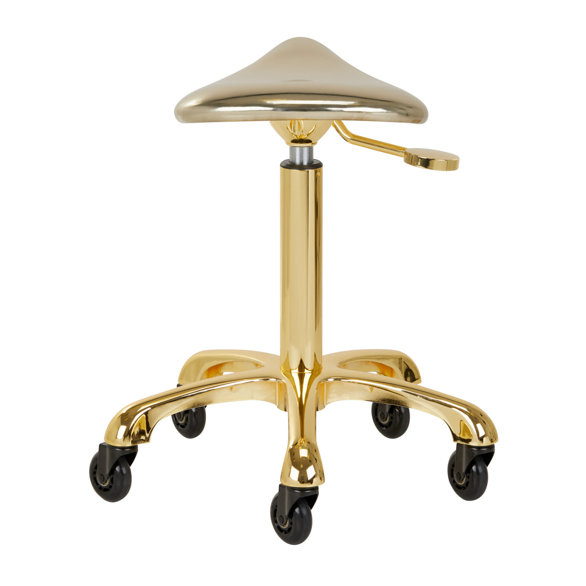 A szék egyedi megjelenése emlékezetes, rendkívül elegánsnak tűnik, és minden belső tér stílusos eleme lesz. Tökéletes lesz fodrász- és szépségszalonokba egyaránt. A krómozott váz és a stabil, gumikerekekkel ellátott ötágú talp biztonságos használatot, jelentős mobilitást és az igényekhez való alkalmazkodás képességét biztosítja. A nyereg alakjában megfelelően profilozott, nem deformálódó habbal töltött ülés garantálja a felhasználók kényelmét. Az arany árnyalatú, félmatt műbőrből készült huzat könnyen tisztítható, tartós és ellenáll a nedvességnek.