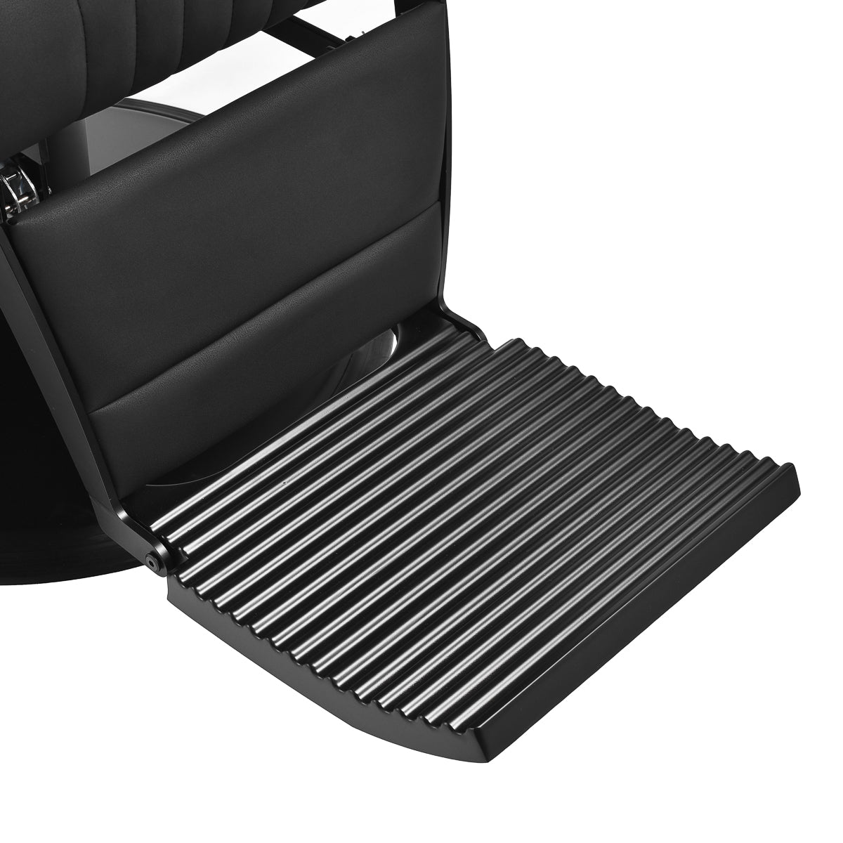 A fekete, kerek alap stabilitást és tartósságot biztosít. A puha, matt műbőr kárpitozás ötvözi a kényelmet a tartóssággal. A felhasznált anyagok nedvességállóak, tartósak és könnyen tisztíthatók. A stílusos varrások és a fekete tónusú kárpitozás egyedi karaktert kölcsönöznek, tökéletesen kiegészítve a modern borbélyszalonok dekorációját. Az elegáns kárpitozás színének kombinációja a fekete vázzal és alappal kiemeli a szék modern, professzionális megjelenését.