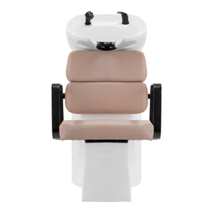 A profilozott szék megfelelő deréktámaszt és ezáltal magas használati kényelmet biztosít. A fekete árnyalatú, geometrikus formájú fém kartámaszok lehetővé teszik az ügyfél vállainak helyes elhelyezését. A tartós, deformációnak ellenálló habbal való töltés és a bézs árnyalatú, kellemes tapintású műbőrből készült kárpit biztosítja a bútor tartósságát, könnyű tisztíthatóságát és kényelmes használatát hosszú időn keresztül. A hajmosó egység eredeti, elegáns megjelenése egyedi kifejezést kölcsönöz a belső térnek. A készlet tartalmaz teljes szerelvényeket fekete árnyalatokban, beleértve egy csapot, egy zuhanyfejet és dedikált tömlőket, hogy teljes eszközkészletet biztosítson a munkához.