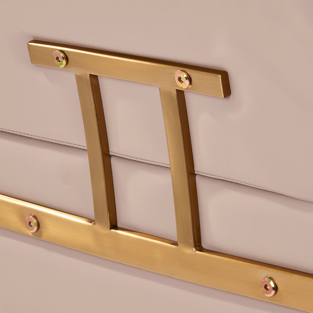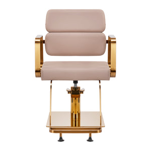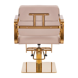 A szék teljes forgási mechanizmusa hatékonyabbá és kényelmesebbé teszi a fodrász munkáját. A szilárd, lapos, négyzet alakú alap stabilitást garantál használat közben. A matt felületű, sima felület elegáns megjelenést kölcsönöz az elemnek, és könnyen tisztán tartható. A kényelmes, habbal töltött ülés magas használati kényelmet biztosít, még a több órás kezelések során is. Az arany árnyalatú geometrikus, fém kartámaszok lehetővé teszik az ügyfél vállainak helyes elhelyezését – ez azt jelenti, hogy nem fúrja a fejét a vállába vagy görnyed – ami sokkal könnyebbé teszi a precíz kezelések elvégzését, beleértve a hajvágást is. Az ehhez a modellhez dedikált stílusos lábtartó stabil támaszt nyújt a felhasználó lábainak.