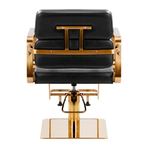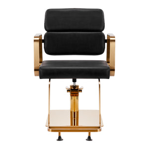 A szék teljes forgási mechanizmusa hatékonyabbá és kényelmesebbé teszi a fodrász munkáját. A masszív, lapos, négyzet alakú alap garantálja a stabilitást használat közben. A matt felületű, sima felület elegáns megjelenést kölcsönöz az elemnek, és könnyen tisztán tartható. A habszivacs töltetű kényelmes ülés magas használati kényelmet biztosít, még a több órás kezelések során is. Az arany árnyalatú geometrikus, fém kartámaszok lehetővé teszik az ügyfél vállainak megfelelő elhelyezését – ez azt jelenti, hogy nem temeti a fejét a vállába, és nem görnyed – ami sokkal könnyebbé teszi a precíz kezelések elvégzését, beleértve a hajvágást is. Az ehhez a modellhez dedikált stílusos lábtartó stabil támaszt nyújt a felhasználó lábainak.