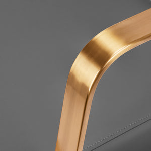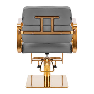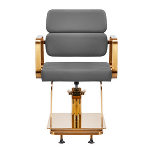 A szék teljes forgási mechanizmusa hatékonyabbá és kényelmesebbé teszi a fodrász munkáját. A szilárd, lapos, négyzet alakú alap garantálja a stabilitást a használat során. A matt felületű, sima felület elegáns megjelenést kölcsönöz az elemnek, és könnyen tisztán tartható. A kényelmes, habbal töltött ülés magas használati kényelmet biztosít, még a sok órás kezelések során is. Az arany árnyalatú, geometrikus, fém karfák lehetővé teszik az ügyfél vállainak megfelelő elhelyezését – ez azt jelenti, hogy nem temeti a fejét a vállába, vagy nem görnyed – ami sokkal könnyebbé teszi a precíz kezelések elvégzését, beleértve a hajvágásokat is. Az ehhez a modellhez tervezett stílusos lábtartó stabil támaszt nyújt a felhasználó lábainak.