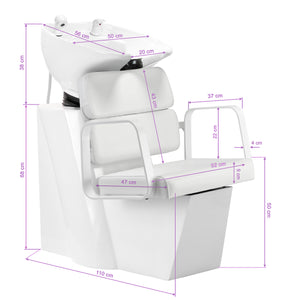 A profilozott szék megfelelő deréktámaszt biztosít, és ezáltal magas használati kényelmet. A fehér árnyalatú, geometrikus formájú fém kartámaszok lehetővé teszik az ügyfél vállainak helyes elhelyezését. A tartós, deformációálló habbal való töltés és a fehér árnyalatú, kellemes tapintású műbőrből készült kárpit biztosítja a bútor tartósságát, könnyű tisztíthatóságát és kényelmes használatát hosszú időn keresztül. A hajmosó egység eredeti, elegáns megjelenése egyedi kifejezést kölcsönöz a belső térnek. A készlet tartalmaz teljes szerelvényeket fehér árnyalatokban, beleértve a csapot, a zuhanyfejet és a dedikált tömlőket, hogy teljes eszközkészletet biztosítson a munkához.