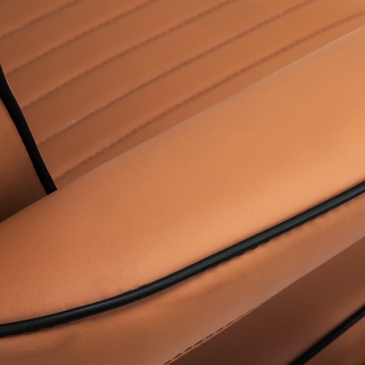 A masszív alapkonstrukció stabilitást és magas kényelmet biztosít. Az ülés deformációálló habbal van töltve és puha, matt műbőrrel kárpitozva, ötvözve a tartósságot a kényelemmel. A felhasznált anyagok nedvességállóak, tartósak és könnyen tisztíthatók, így a szék tökéletes a mindennapi használatra. A stílusos varrás és a barna árnyalatú kárpitozás egyedi karaktert kölcsönöz neki, tökéletesen illeszkedve a modern borbélyszalonok dekorációjához.