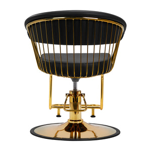 A tartós hidraulikus emelő lehetővé teszi az ülésmagasság beállítását 48-55 cm között, még akkor is, ha az ügyfél a székben ül. Ez ergonomikusabb munkát garantál, köszönhetően annak, hogy a szék szintje szabadon állítható mind az ügyfél, mind a fodrász magasságához, valamint a teljes elforgatás lehetőségének. A tökéletesen profilozott háttámla szintetikus bőrrel borítva kényelmes pozíciót tesz lehetővé. Ez megfelelő támaszt nyújt a hátnak, ami különösen fontos a sok órás kezelések során. Vizuálisan érdekes elem itt egy fém, polírozott, kifinomult részlet arany árnyalatokban, amely összeköti a háttámlát az üléssel. A kialakított rések megkönnyítik a szalon tisztán tartását, lehetővé téve a haj könnyű eltávolítását a szék minden zugából. Ez időt takarít meg a munkaállomás előkészítésénél az ügyfelek között.