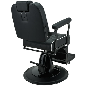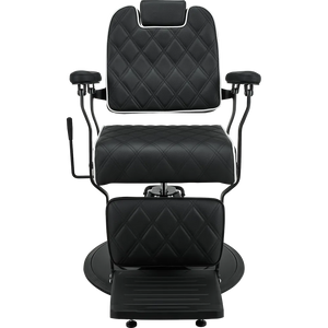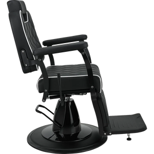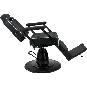 BRAVO barber chair Elegance in a minimalist spirit. A lightweight metal frame combined with black upholstery featuring geometric stitching and contrasting piping. Equipped with an adjustable backrest and a comfortable footrest, this chair ensures comfort for both the client and the barber. A great choice for modern barber and hair salons. Black upholstery