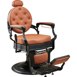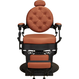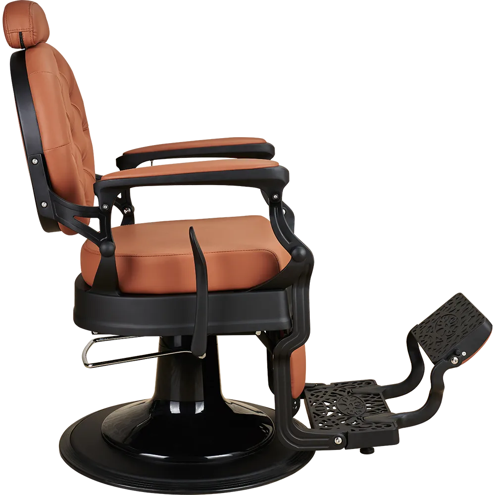 This chair is the quintessence of vintage style inspired by the 1920s. Its hallmarks include an openwork footrest, warm brown button-tufted upholstery, a matte black frame, as well as a towel holder and headrest hanger. Warm brown upholstery.