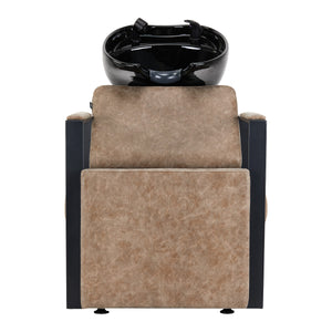 A megfelelően profilozott szék tartós habbal van kitöltve, ami magas használati kényelmet biztosít, a geometrikus, részben kárpitozott karfák pedig lehetővé teszik az ügyfél vállainak helyes elhelyezését. A háttámla optimális szögben van elhelyezve, és kiváló támaszt nyújt a gerincnek. A barna árnyalatú műbőrből készült borítás hosszú távú tartósságot és könnyű tisztítást garantál. A mosdó eredeti, elegáns megjelenése egyedi kifejezést kölcsönöz a belső térnek. A stabilizáló lábak stabilitást adnak, és finoman hangsúlyozzák a fodrászati hajmosó stílusos karakterét. A készlet tartalmazza a matt fekete árnyalatú komplett szerelvényeket, beleértve a csaptelepet, a zuhanyfejet és a dedikált tömlőket, hogy teljes eszközkészletet biztosítson a munkához.