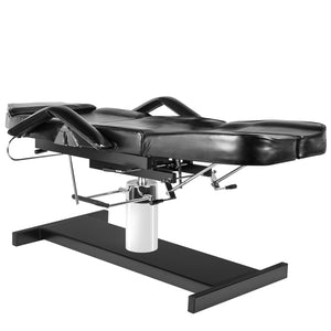 forgószék blokkolással, osztott lábtartókkal, hidraulikusan emelhető és süllyeszthető, lyukkal a fejtámlában, tökéletes kozmetikai kezelésekhez, pedikűrhöz, sminkhez és masszázshoz. kivehető karfákkal és dugóval rendelkezik a fejtámlában. könnyen mosható üléshuzat, öko-bőrből készült, megfelel a szigorú eu követelményeknek, esztétikus, nikkelezett fém elemek. a fotel fekete színben kapható.