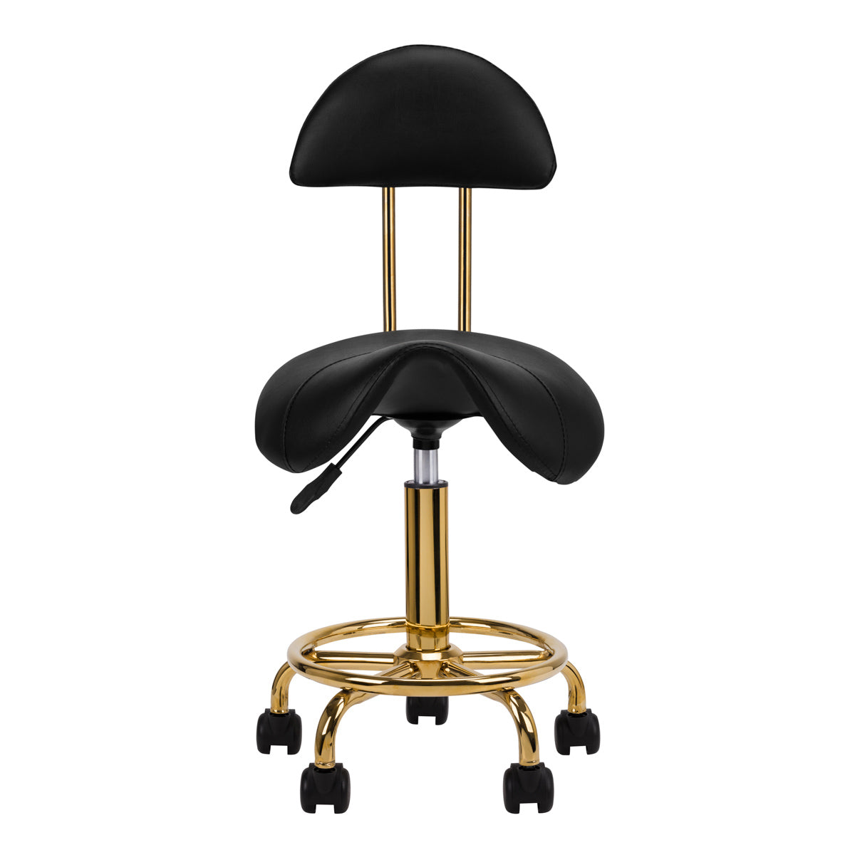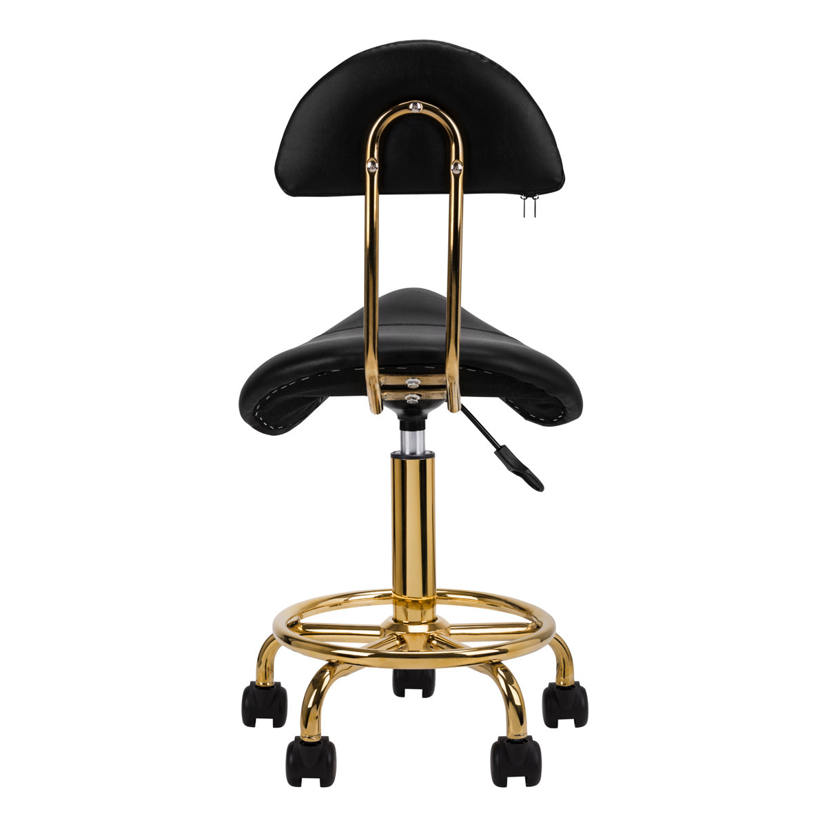 Kényelmes, stabil kozmetikai szék háttámlával, profilozott üléssel, arany színű fém elemekkel. Ötágú talpon, műanyag kerekekkel. Fehér színben kapható, elengedhetetlen bútordarab egy szépségszalonban. Lakkozott fém felületek.