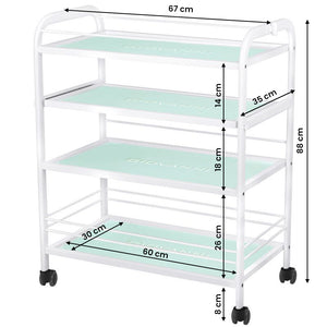 esztétikus asztal kozmetikai készülékhez, fémből és üvegből, kerekekkel. négy üvegpolccal rendelkezik.