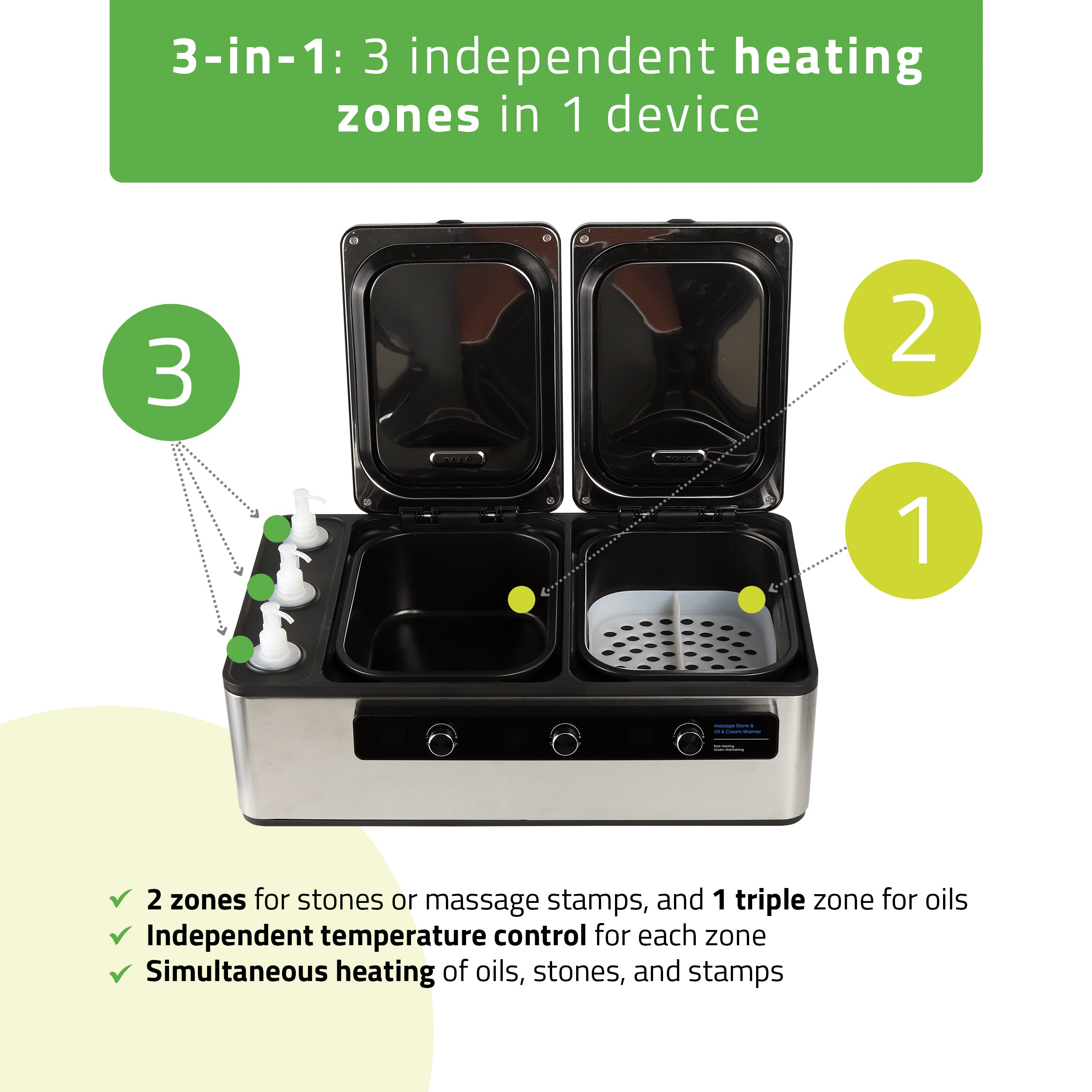 A multifunkcionális kő- és olajmelegítő professzionális masszázsstúdiókba, szépségszalonokba és gyógyfürdőkbe (spa) készült. Kiváló támogatást nyújt az átfogó relaxációs és terápiás kezelésekhez.