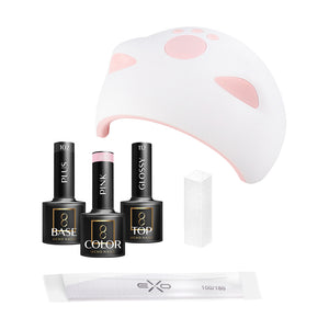 A készlet tartalmazza a körömformázáshoz szükséges alapvető termékeket. Tartalmaz hibrid lakkokat, folyadékokat és előkészítőket, valamint kiegészítőket. Ezenkívül kiegészül egy professzionális lámpával a hibrid körmök kikeményítéséhez.