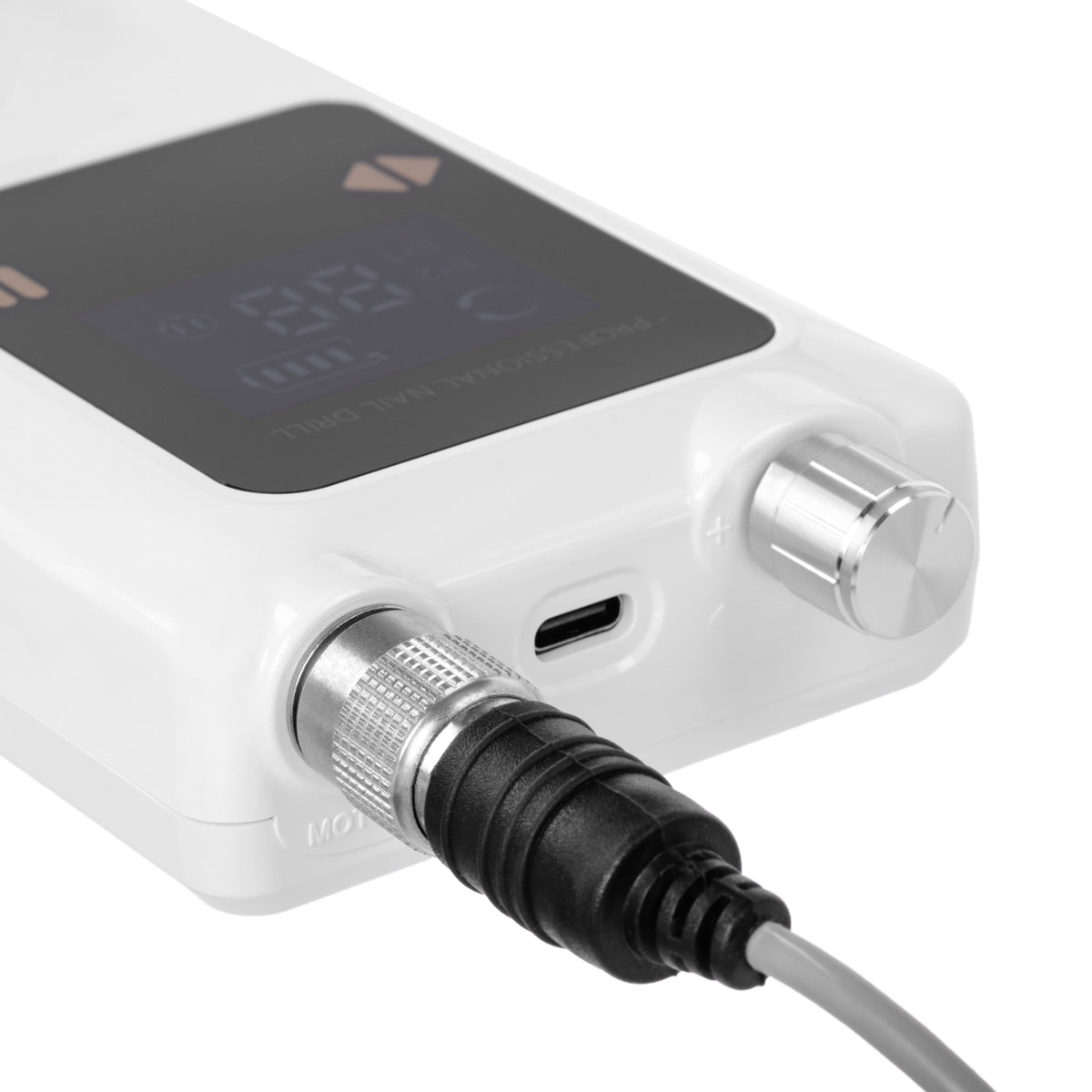 The built-in 2000 mAh battery allows for up to 9 hours of operation on a single charge. The nail drill operates quietly, eliminating annoying noise and ensuring comfort for both the person performing the treatment and the clients. In addition, the device has been designed with ergonomics in mind – the convenient button layout and intuitive operation ensure that every treatment runs smoothly.