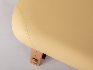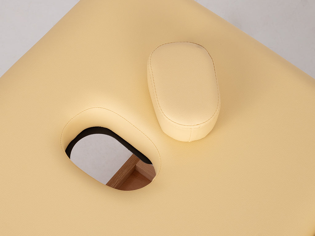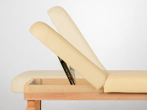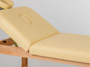 A kettős törésű asztallap lehetővé teszi a páciens számára, hogy a legkényelmesebb pozícióba helyezkedjen el, az elvégzett kezelés típusától függően. A 6 cm-es habbal töltött és kellemes tapintású kárpittal borított ágy teljes kényelmet biztosít a páciensnek, és lehetővé teszi a szabad testhelyzetet. Az ágy alatti funkcionális polc további helyet biztosít a kezelés során szükséges kiegészítők és kozmetikumok számára. A természetes fa alap elemek nagy esztétikai értéket adnak a kanapénak.