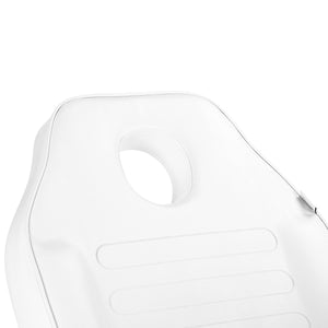 Special levers allow for adjustment of the backrest and footrest angles, enabling precise customisation of settings to individual needs. The chair can be reclined all the way to a lying position, which significantly enhances its functionality during facial and body treatments. An opening in the headrest, concealed beneath a profiled pillow, makes the model , such as massages. When fully reclined, the chair is approximately 2 metres long, providing stable support for the entire body and a high level of comfort for both the client and the practitioner.