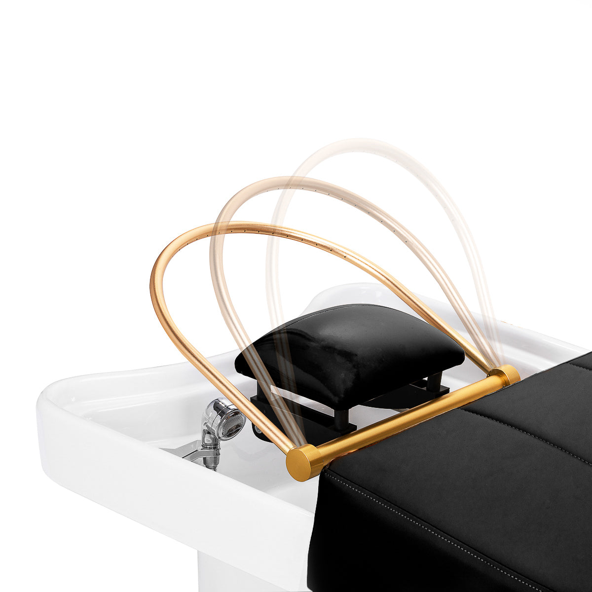 The golden arc with an adjustable angle of inclination, designed for the Waterfall Head SPA, is an innovative solution that allows for holistic care of the scalp. The water jets act as a natural massage, improving blood circulation, reducing tension and stress. The precisely controlled water flows support hair regeneration and intensively moisturise the skin. The waterfall arc with the possibility of adjusting the angle ensures deep cleansing of the scalp and relaxation, bringing relief from ailments such as headaches or stiff neck. Thanks to an intelligent closed-loop system, the arc draws water from the bowl and reuses it, providing an uninterrupted water massage. This is a combination of technology and relaxation that supports hair health and well-being