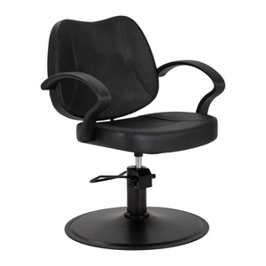 The durable body and synthetic leather in shades of black ensure moisture resistance, solidity and durability. The round base in shades of black guarantees stability and durability. The streamlined upper backrest adds a visual lightness, emphasizing the chair's modern character, while the meticulous details demonstrate the high quality of craftsmanship. The minimalist black color combined with aesthetic stitching makes the chair blend seamlessly with various salon interior styles, adding an elegant and modern touch.