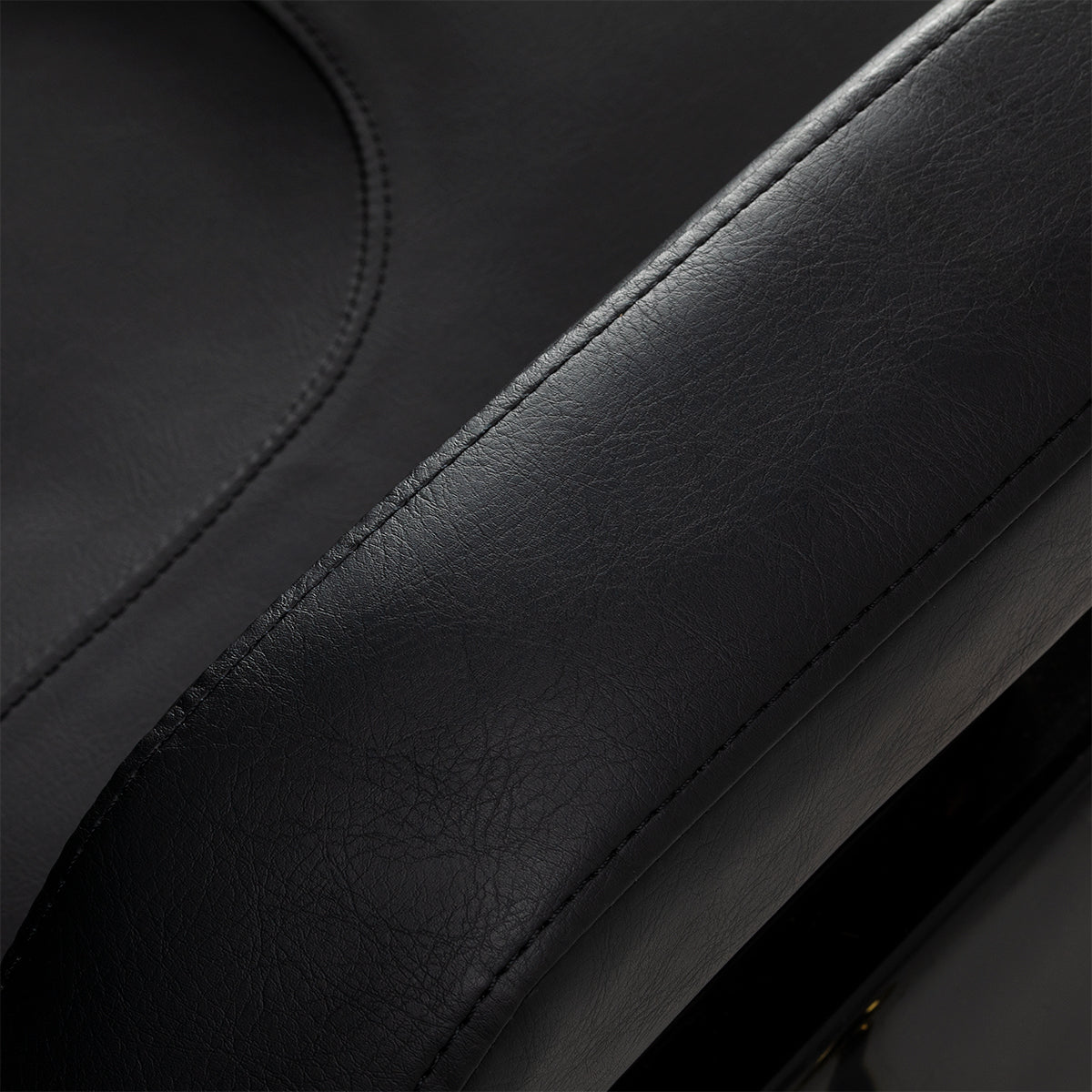 The stable circular base in a gold finish gives the chair a striking appearance and guarantees stability when working. The seat, back and footrest are filled with warp-resistant foam and upholstered in black, pleasant-to-touch synthetic leather for durability and high comfort. The moisture-resistant and easy-care surface makes the chair perfect for everyday use. The gold details and distinctive lines of the upholstery emphasise the exclusive character of the furniture, giving it a modern, slightly automotive style. The elegant design fits perfectly into the décor of barbershops.