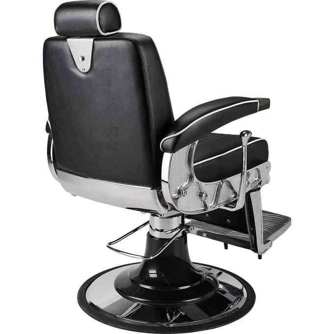 A model for lovers of classic elegance in the barbershop. It features a chrome frame with decorative sides, vertical stitching on the backrest and seat, and is finished with elegant white trimming. Black upholstery with vertical stitching