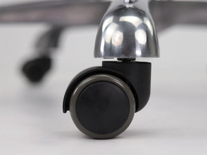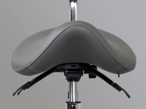 Ergonomic saddle stool with backrest and advanced seat and backrest adjustment. The contoured seat ensures optimal weight distribution and facilitates a natural posture. Solid construction and backrest provide full stability. Wheels allow for smooth movement. The stool has an aluminum, chrome-plated construction.