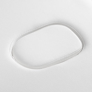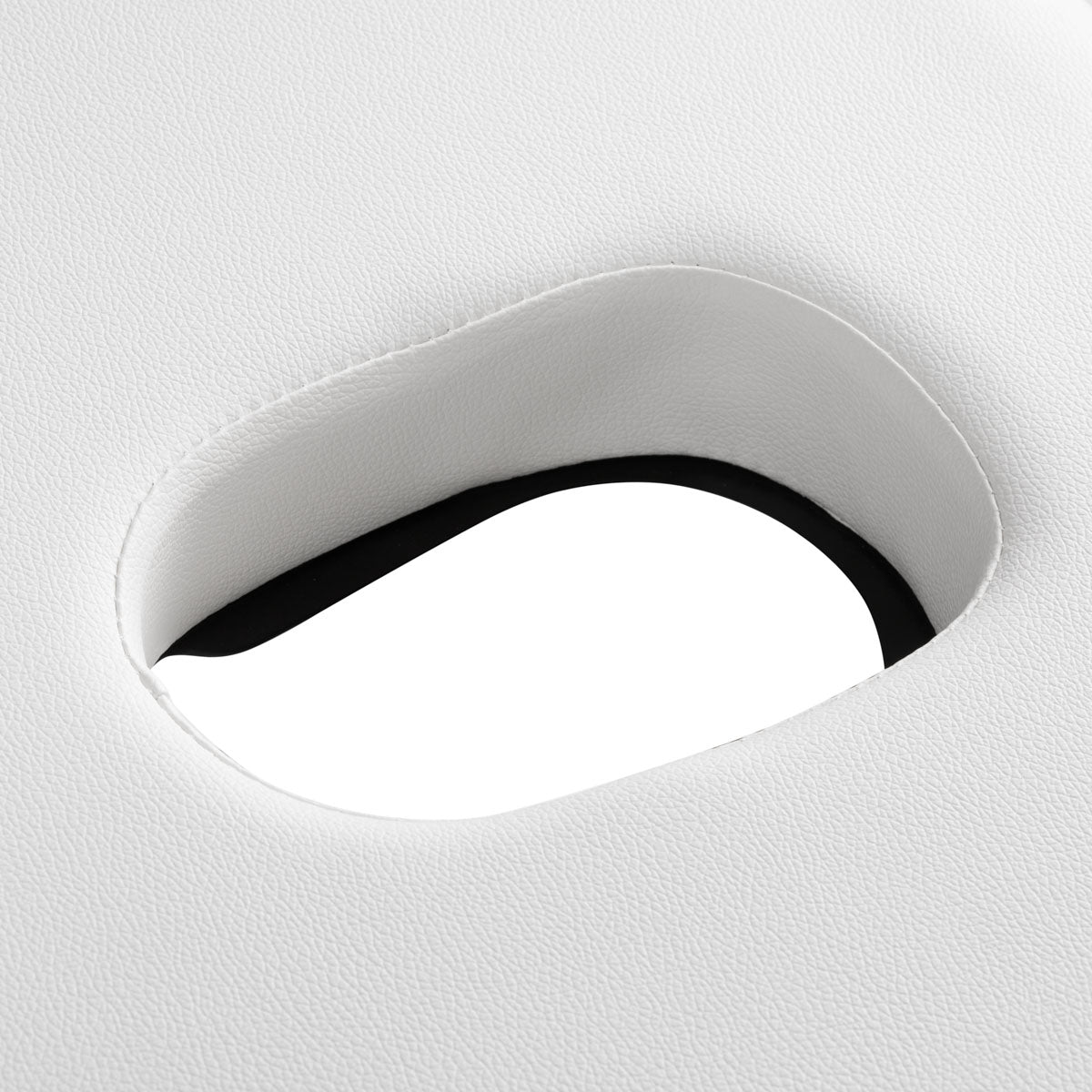 A maximális kényelem érdekében az asztalt használó személy az ergonomikus fejtámlán pihentetheti a fejét, amely a készlet része. Ez az elem könnyen állítható – két síkban teszi lehetővé a szög beállítását, ami lehetővé teszi a pozíció pontos beállítását a felhasználó igényeihez és a végzett kezelés jellegéhez. Hanyatt fekvő terápiához a fejtámla eltávolítható, helyette az asztallap speciális nyílását használva. Amikor nincs használatban, a nyílás a mellékelt dugóval lefedhető, visszaállítva a felület esztétikus és egységes megjelenését.