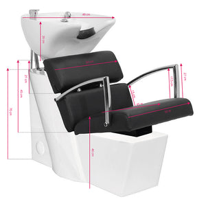 professzionális fodrászati mosó - stabil, rendkívül kényelmes, masszívan felépített. A modern kialakítás gyönyörű kiegészítője a modern fodrászszalon felszerelésének. Az ülés kiváló minőségű barna ökobőrből készült. A szilikon fejpárna stabilizálja az ügyfél fejét, és lehetővé teszi annak kényelmes elhelyezését a mosón. Fehér myki tál, dőlésszögének állítási lehetőségével. Fekete autómosó