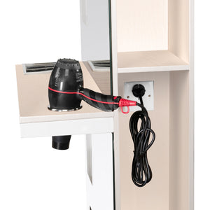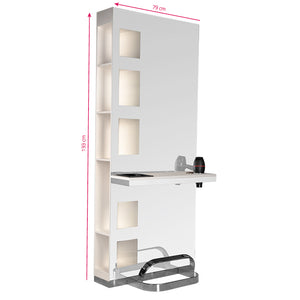 egy modern fodrászkonzol nagy tükörrel és praktikus polcokkal mindkét oldalon. a polcok tartalma az egyik oldalon látható a csúcsminőségű kivitelű "ablakokon" keresztül. elegáns és egyben univerzális belsőépítészeti elem, amely kiemeli bármely nappali karakterét.